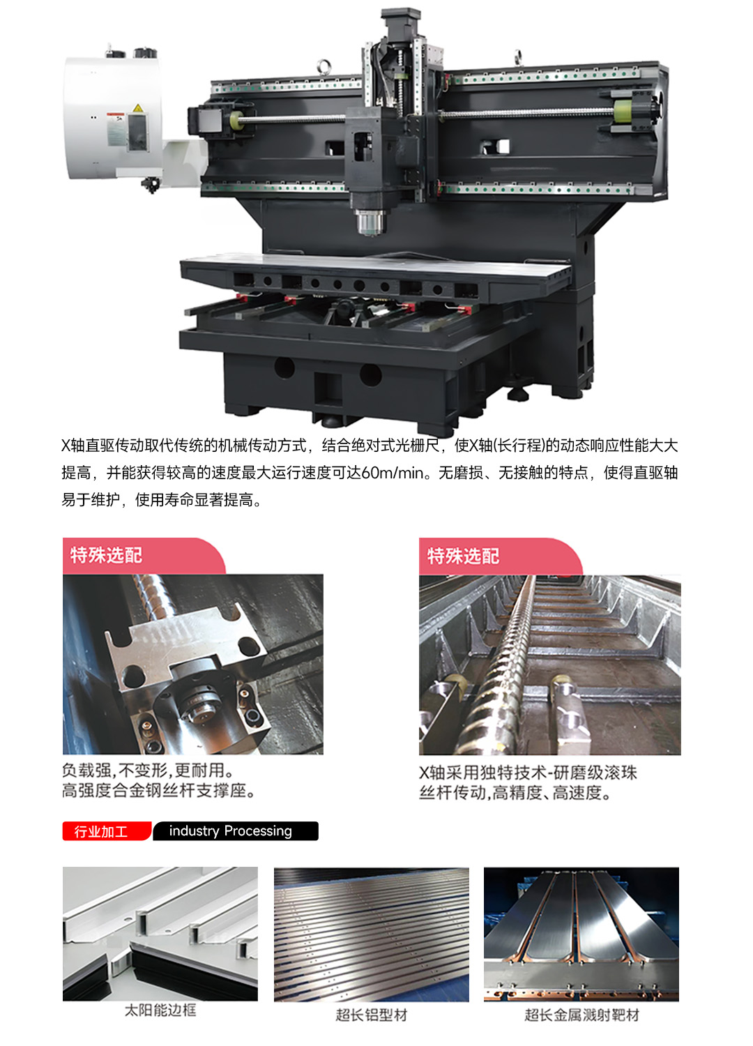 X轴直接驱动传动取代了传统的机械传动方式,并结合了绝对光栅尺,极大地提升了X轴(长行程)的动态响应性能,实现了高达60米/分钟的最大运行速度。