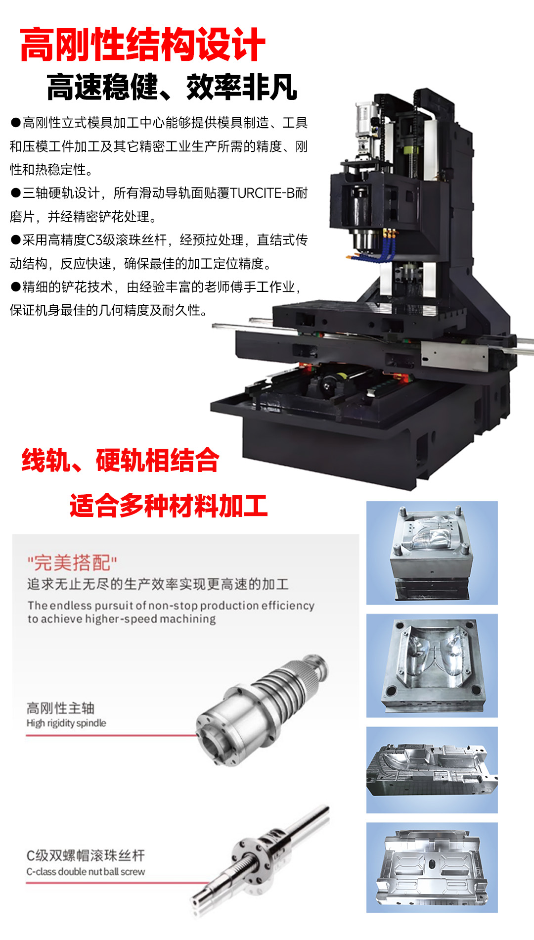 - The design features a three-axis hard rail system, with all sliding guide surfaces coated with TURCITE-B wear-resistant sheets and subjected to precision honing treatment.